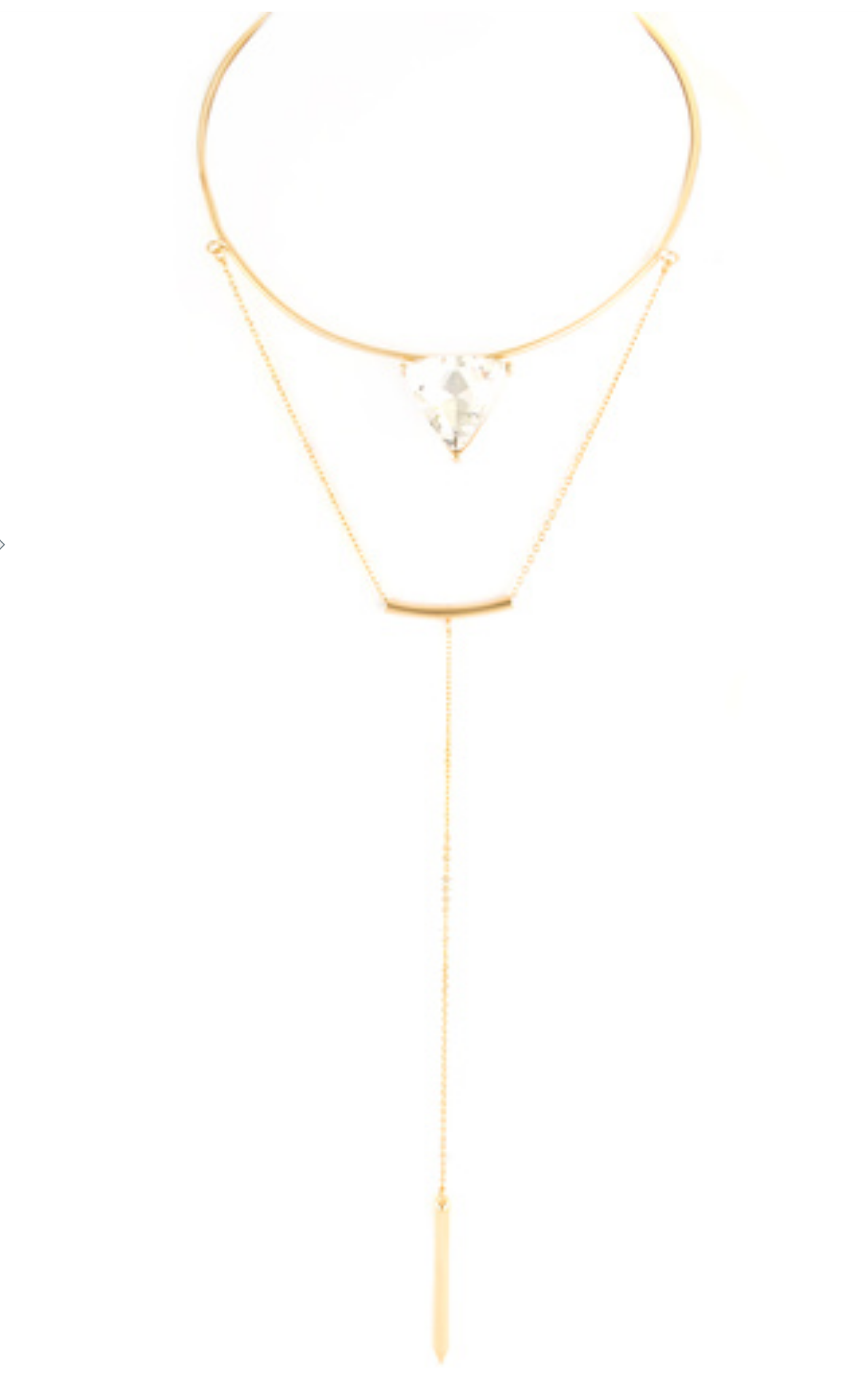 Glass triangle stone and metal bar choker necklace. Length: 15" + 3" extension. Pendant/bar drop: 10".