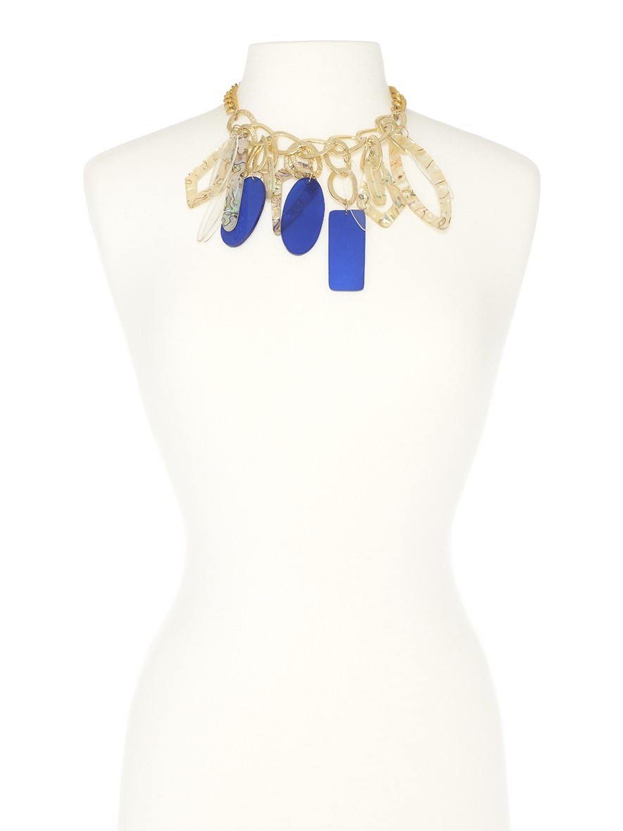 This fringe necklace is comprised of geometric blue and abalone shapes that hang from a gold link chain. - Style Necklace - 18in length - Lobster Claw Closure - Nickel and Lead Compliant (Hypoallergenic)