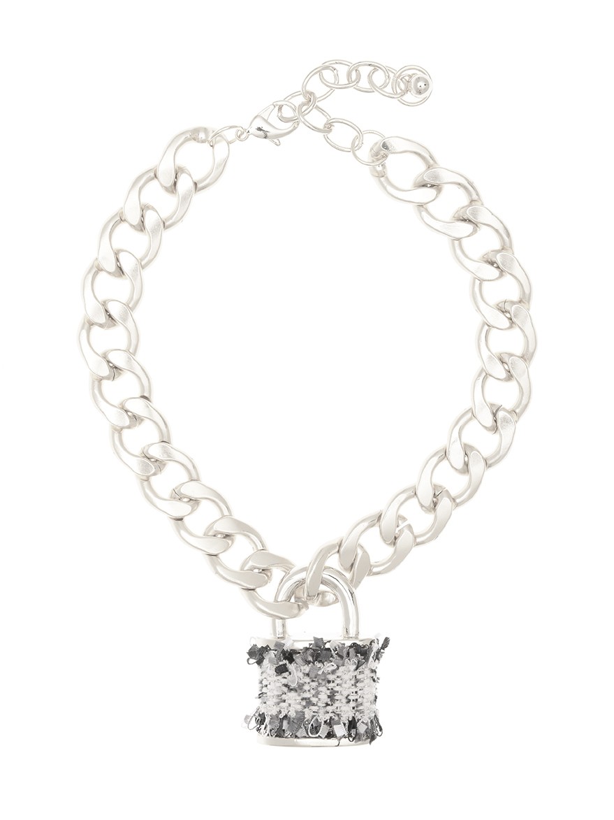 The short version of this chunky chain and lock combo necklace. It's tweed covered padlock adds a touch of chic to this in-your-face style. - Style Necklace - 17in length - 2in lock pendant - Nickel and Lead Compliant (Hypoallergenic)