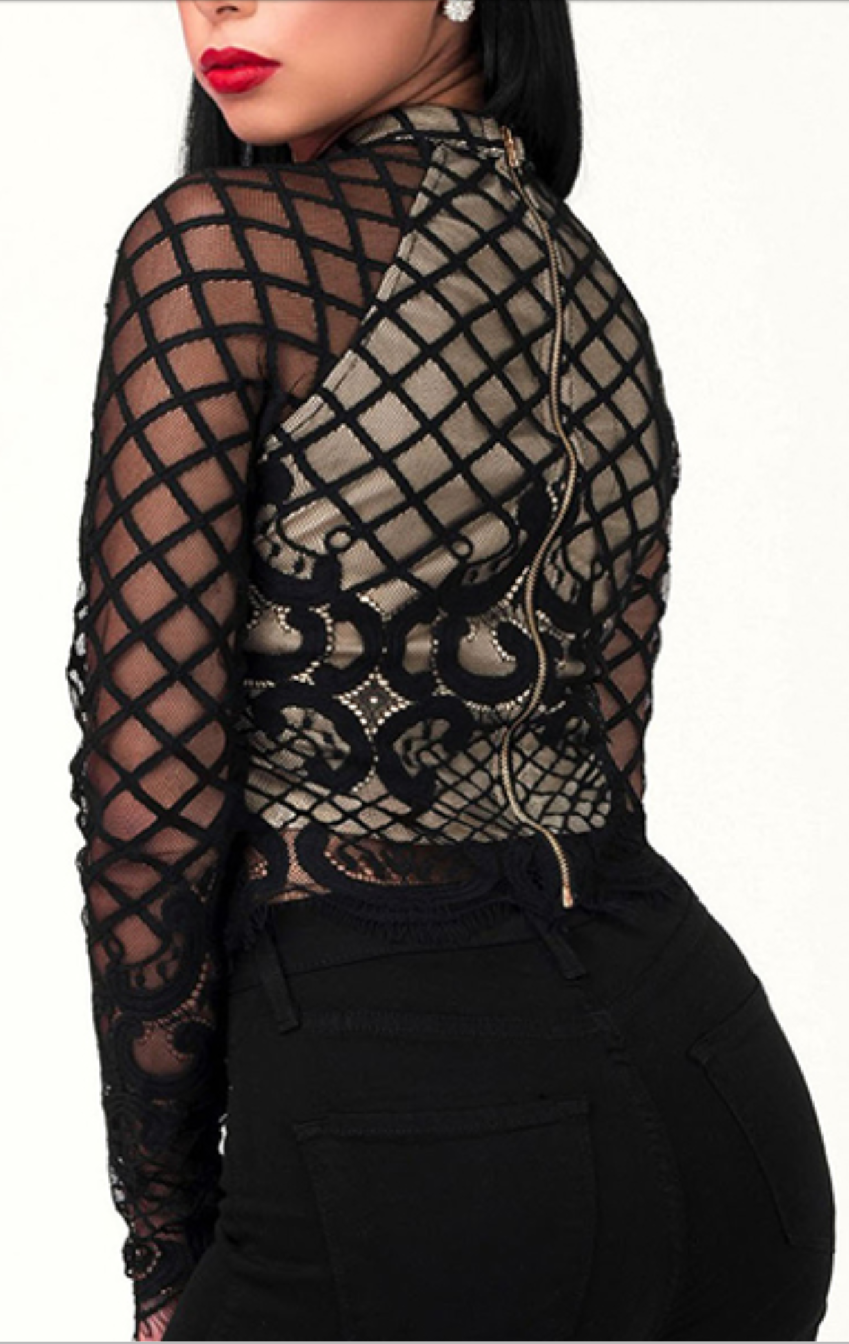 Trendy Long Sleeves Lace Trim Patchwork Black Polyester Shirts